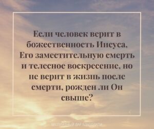Но разве имеет смысл тот факт, что мы можем заменить вечную жизнь в Иоанна 3:16 на временную или “испытательную” жизнь и по-прежнему иметь ту же самую весть? Очевидно нет. Поэтому я понимаю, почему некоторые люди говорят, что если человек верит в Иисуса (а под этим они понимают веру в Его божественность, заместительную смерть на кресте и телесное воскресениеiv), то он навечно обезопасен, даже если он не верит, что что-либо получает от Иисуса в результате веры в Него. Если результат веры в Иисуса не является частью того, что значит верить в Него, тогда человек, который не поверил в жизнь после смерти, родился бы заново, если бы поверил в божественность Иисуса, Его смерть и воскресение.
