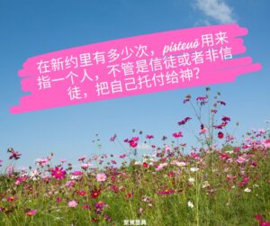 pisteuō一词在新约中使用了246次。其中 238 次被译为 “相信“,包括《约翰福音》中的 99 次。