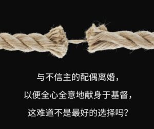 保罗告诉信主的配偶不要这样想,应尽可能的避免离婚。他给出了信徒与非信徒保持婚姻关系的两个理由:1)配偶;2)孩子。