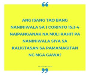Naniniwala ako pareho sa 1 Cor 15:3-4 at Juan 3:16. Ngunit ako ay kumbinsidong naipanganak na muli dahil naniwala akong totoo ang Juan 3:16. Kung naniwala lamang ako sa 1 Cor 15:3-4, ako ay hindi pa ring naipanganak na muli. (Para sa pagtalakay ng mga salitang “sa pamamagitan naman nito’y ligtas kayo kung matiyaga ninyong iingatan ang salitang ipinagaral ko sa inyo” (1 Cor 15:2), tingnan ang artikulong ito at makinig sa podcast na ito. Ang sitas na ito ay patungkol sa sanktipikasyon, hindi kapanganakang muli.