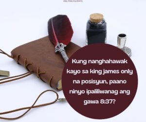 Ikaanim, bagama’t maaaring may tagataguyod ng King Jame Only (KJVO) ang sisipi ng sitas na ito upang patunayang may espesyal na uri ng pananampalatayang kailangan upang maipanganak na muli, hindi ko sila batid. Ang hula ko ay karamihan sa mga KJVO ay nagtuturong, “whosoever surely meaneth me” (ang sinuman ay siguradong patungkol sa akin)2 Iniisip kong sang-ayon sila sa limang puntos na aking ginawa.