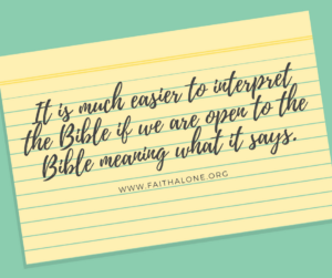 I’m not saying that it is always easy to interpret the Bible. I’m saying that it is much easier if we are open to the Bible meaning what it says. A common saying in interpretation is this: When the plain sense of Scripture makes common sense, seek no other sense. I might modify that saying in this way: When what appears to be the plain sense of Scripture makes common sense, then confirm that is the plain sense, and then seek no other sense.