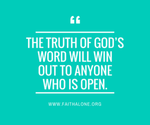 Here is the beauty of the broken record approach. The truth of God’s Word will win out to anyone who is open. If a person will keep on listening and thinking and praying, eventually he will see that Eph 2:8-9, or whatever text you keep repeating, is true. The Holy Spirit will open his heart to see it as true (Acts 11:14;see also Acts 17:11).