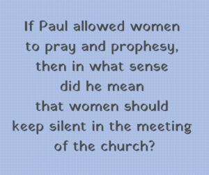 Some authors point out that Paul’s prohibition against women speaking in church (1 Cor 14:34) must not mean exactly that, because earlier in 1 Corinthians (11:5) Paul had said that when women pray or prophesy, they should have their heads covered. Obviously, women can’t be silent if they are praying or prophesying.
