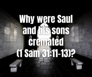 Second, the Bible only gives one example of cremation. In 1 Sam 31:11-13, the closing verses of the book, we are told that Saul and his sons were cremated: “and they came to Jabesh and burned them there. Then they took their bones and buried them under the tamarisk tree at Jabesh, and fasted seven days.” We are not told if cremation was proper or not. However, that is telling. If it were wrong, we’d expect a statement to that effect.