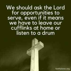 How sad would it be to say that we could not worship with other believers because of these things. Paul didn’t. And we do not have to go around the world the run into this situation. We are all comfortable doing certain things. We feel most comfortable around certain kinds of people. Sometimes, however, when we want to minister to others, we must leave our comfort zone. We should ask the Lord for opportunities to do so, even if it means we have to leave our cufflinks at home or listen to a drum.