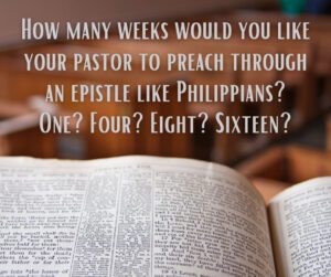 I find that if I preach through a book or letter and teach the author’s/Author’s message, then I’m not trying to come up with my own message that I might baptize in a few verses that aren’t really on that subject.