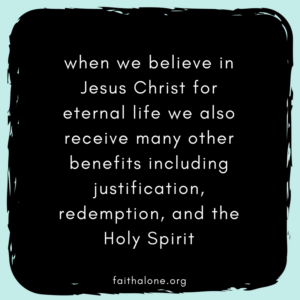 However, when we believe in Jesus Christ for eternal life we also receive many other benefits. Oftentimes people look at these other benefits and conclude that they are the same thing as receiving eternal life. But they are not. We receive them at the same time we receive eternal life, but they are different things. When we look at these things we get a clearer picture of just how great our salvation from hell is.