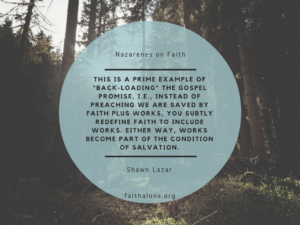 This is a prime example of “back-loading” the gospel promise, i.e., instead of preaching we are saved by faith plus works, you subtly redefine faith to include works. Either way, works become part of the condition of salvation.