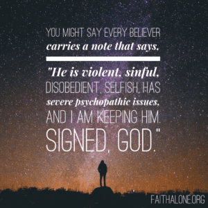 You might say every believer carries a note that says, “He is violent, sinful, disobedient, selfish, has severe psychopathic issues, and I am keeping him. Signed, God.”