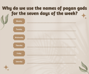 Sunday is named after the Roman sun god (though in Spanish and Italian, it is the Lord’s day: Domingo and Domenica). Monday is named for the moon god. Tuesday is named for the Danish god Tyr, the Germanic god of war, Tiu, or in other languages, the Roman god of war, Mars (Spanish, Martes; Italian, Martedi). Wednesday is named after the Norse god Odin (also called Woden’s). Thursday is named for the Nordic god Thor. Friday is Freya’s day, the goddess of love, or Venus’s day, the Roman goddess of love, in other languages (Viernes in Spanish and Venerdi in Italian). In English, Saturday is named after Saturn, the Roman god of time. However, in other languages Saturday is named after the Jewish sabbath (Sabado in Spanish and Sabato in Italian).