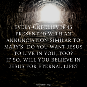 “I think our annunciation is even more literal than that. Every unbeliever is presented with an annunciation similar to Mary’s—do you want Jesus to live in you, too? If so, will you believe in Jesus for eternal life? (John 3:16, 36; 5:24; 6:47). That’s the one condition. Those who believe in Jesus for what He promises, receive eternal life. And here’s the amazing thing. As Jesus revealed to the disciples in the upper room, it turns out eternal life is not a thing they have, but a Person who has them! It turns out that Jesus Himself is the life He gives to believers (John 1:4; 14:6; 1 John 1:1-2)! Hence, Paul could say “it is no longer I who live, but Christ lives in me” (Gal 2:20). Christ lives in every believer! But where Mary’s pregnancy lasted for 9 or 10 months, by contrast, Jesus lives in believers forever and ever.”