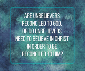 The word reconcile (katallassō) refers to “the exchange of hostility for a friendly relationship” (BDAG, p. 521). The death of Christ means that God in some sense no longer is in a hostile relationship with unbelievers. However, compare Col 1:21-22: “And you, who once were alienated and enemies in your mind by wicked works, yet now He has reconciled in the body of His flesh through death, to present you holy, and blameless, and above reproach in His sight. Prior to their faith in Christ, the people in Colossae were “alienated and enemies.” But the enmity was on their side. They were enemies in their minds. The reconciliation of Col 1:21 is the same as the command to “be reconciled to God” in 2 Cor 5:20.