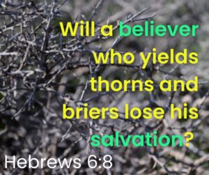 Hebrews 6:8. “But that which beareth thorns and briers is rejected, and is nigh unto cursing; whose end is to be burned” (KJV). Verses 7-8 are an illustration of what the author was warning about in Heb 6:4-6. A believer who falls away from the faith is like a field that yields “thorns and briers,” is rejected (adokimos, disapproved), and “whose end is to be burned.” There is a clear allusion here to Genesis 3 and the cursing of the earth so that it yielded thorns and briers. If our lives are like that, then we earn a curse.
