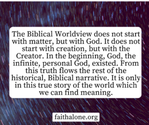 The Biblical Worldview does not start with matter, but with God. It does not start with creation, but with the Creator. In the beginning, God, the infinite, personal God, existed. From this truth flows the rest of the historical, Biblical narrative. It is only in this true story of the world which we can find meaning.