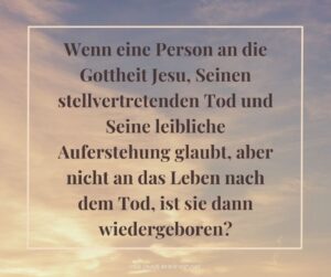 Aber macht es Sinn, dass wir das ewige Leben in Johannes 3,16 durch ein vorübergehendes Leben oder ein Leben auf Probe ersetzen können und trotzdem dieselbe Botschaft erhalten? Offensichtlich nicht. Deshalb verstehe ich einige Leute so, dass sie sagen, dass wir, wenn wir an Jesus glauben (was sie so verstehen, dass wir an die Gottheit Jesu, Seinen stellvertretenden Tod am Kreuz und Seine leibliche Auferstehung glauben4), ewig sicher sind, auch wenn wir nicht glauben, dass wir als Folge des Glaubens an Ihn etwas von Jesus erhalten. Wenn das Ergebnis des Glaubens an Jesus nicht Teil dessen ist, was es bedeutet, an Ihn zu glauben, dann würde eine Person, die nicht an ein Leben nach dem Tod glaubt, wiedergeboren werden, wenn sie an Jesu Gottheit, Tod und Auferstehung glaubt.