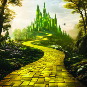 In the story of The Wizard of Oz, Dorothy and her friends go to the capital city to meet the Wizard in the hope that he could help the heroine get back home. The capital is called the Emerald City, and it is noted for being a bright green town. The movie shows the capital shining in the distance as the group heads towards its gates.