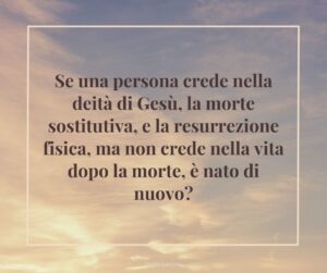 Ma, ha senso sostituire la vita eterna di Giovanni 3:16 con una vita temporanea o una vita probatoria e ottenere lo stesso messaggio? Ovviamente no. Ecco perché alcune persone dicono che se uno crede in Gesù (che vuol dire credere nella deità di Gesù, morte sostitutiva sulla croce, e la Sua resurrezione corporaleiv), allora è eternamente sicuro anche se non crede di ricevere nulla in cambio per aver creduto in Lui. Se il risultato del credere in Gesù non fa parte di quello che vuol dire credere in Lui, allora persino chi non crede nella vita dopo la morte sarebbe nato di nuovo se ha creduto nella deità, la morte e la resurrezione di Gesù.