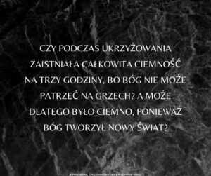 Jestem niemal przekonany o tym, że powiedziano ci to samo, co mnie o tej dziwnej ciemności. A mianowicie, że ona obrazuje fakt, że Bóg Ojciec odwrócił się od Swojego Syna. Jezus wziął na siebie grzechy świata, a Bóg nie może patrzeć na grzech. Nie mógł patrzeć na Swojego Syna. Gdy się odwrócił, niebo stało się ciemne. Słyszałem wiele kazań mówiących właśnie o tym, że to jest powodem tego, co się wydarzyło.