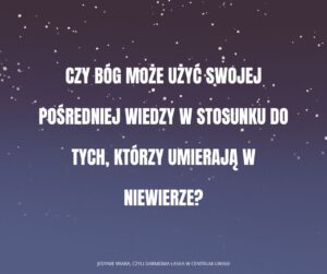 Wiedza pośrednia to pogląd, że Bóg wie, co by się stało w innych okolicznościach. Na przykład Jezus powiedział, że ustanowiłby swe królestwo w pierwszym wieku, gdyby Izrael był chętny (Mt 23:37-39). Powiedział również, że Tyr i Sydon pokutowałyby, gdyby dzieła, których dokonał w Izraelu, zostały tam dokonane (Mt 11:21). TDŁ zgadza się z Pismem Świętym, a więc z wiedzą pośrednią. Myślę jednak, że powodem, dla którego czytelnik myślał, że nie wierzymy w wiedzę pośrednią, jest to, że nie wierzymy, że Bóg użyje wiedzy pośredniej, aby zbawić tych, którzy nigdy nie uwierzyli w Jezusa, ale którzy uwierzyliby w innych okolicznościach. Pismo Święte mówi jasno, że „jest postanowione ludziom raz umrzeć, a potem sąd” (Hbr 9:27). Pan Jezus powiedział: „A każdy, kto żyje i wierzy we mnie, nigdy nie umrze [duchowo]” (Jana 11:26a). Zobacz również Jana 8:21, 24. Nie będzie żadnej innej sposobności dla ludzi powyżej wieku odpowiedzialności, aby narodzili się na nowo [duchowe odrodzenie] po tym, jak umrą w niewierze. To, o czym rozmawialiśmy w poście na Facebooku, to spekulacje, że Bóg mógłby użyć wiedzy pośredniej do zbawienia tych, którzy umarli w niewierze, gdyby nigdy nie słyszeli o Chrystusie i gdyby uwierzyli w Niego w odpowiednich okolicznościach. Przypuszczam, że większość ludzi doszłaby do wiary, gdyby dane im było zobaczyć zmartwychwstałego Pana na drodze damasceńskiej. Poza tym, to zastosowanie wiedzy pośredniej można by logicznie rozszerzyć na wszystkich, którzy usłyszeli o Jezusie, ale nie usłyszeli jasnej prezentacji ewangelii.
