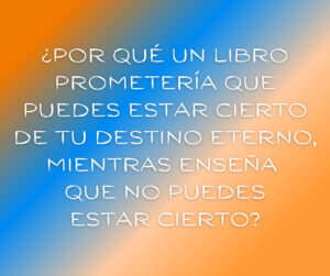 En el título y subtítulo, Inserra implica que es posible estar cierto de tu destino eterno. En varios lugares de este libro corto (79 páginas en un pequeño tamaño de 5”x7”), Inserra afirma que los creyentes pueden y deben estar ciertos. Por ejemplo, la última frase del libro dice, “Confía en Cristo, arrepiéntete de tus pecados, y nunca más tendrás que preguntarte acerca de tu posición con Dios” (p. 75). Como se puede ver, Inserra no menciona la necesidad de creer la promesa de vida allí. Menciona confiar en Cristo y arrepentirse de tus pecados. Y no dice que si haces estas cosas, estarás cierto. Dice que si tú haces esas cosas, entonces nunca más tendrás que preguntarte acerca de eso. En el resto del libro, él explica lo que tienes que hacer para evitar preguntarse acerca de tu posición.