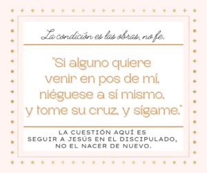 Cuando estaba en un club de chicos de Salvación por Señorío extremo, entendía estos versículos como que para entrar en el cielo tenía que 1) negarme a mí mismo, tomar mi cruz y seguir a Cristo, y 2) tenía que seguir haciéndolo perfectamente hasta que muriera. Pensé que, si cometía un pecado después de ser salvado, entonces perdería mi salvación y nunca podría recuperarla.