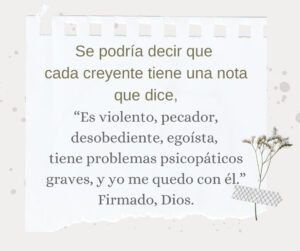 Podría decirse que cada creyente tiene una nota que dice, “Es violento, pecador, desobediente, egoísta, tiene problemas psicopáticos graves, y yo me quedo con él.” Firmado, Dios.